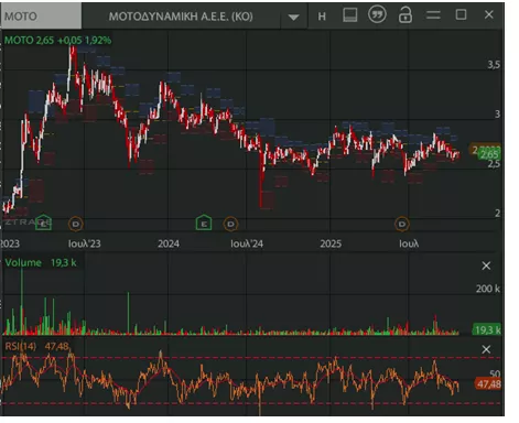 Η μετοχή φλερτάρει με την αντίσταση ενός πολύμηνου πλαγιοπτωτικού σχηματισμού. Αν διασπάσει με όγκο τα 3,50€, ανοίγει ο δρόμος για τα 3,80€, όπου εντοπίζεται το επόμενο επίπεδο αντίστασης.