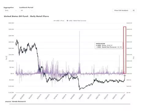 📊 Τα τελευταία στοιχεία δείχνουν μια εντυπωσιακή μεταστροφή στη συμπεριφορά των ιδιωτών επενδυτών, καθώς μεγάλα ποσά κατευθύνονται προς τα ETF πετρελαίου. Το United States Oil Fund ($USO) κατέγραψε ημερήσιες εισροές λιανικής +36 εκατ. δολάρια, το υψηλότερο επίπεδο που έχει καταγραφεί ποτέ.