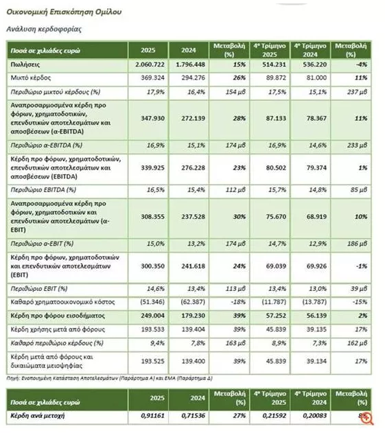 💶 Οι πωλήσεις ξεπέρασαν για πρώτη φορά τα 2 δισ. ευρώ, αγγίζοντας τα 2,06 δισ. ευρώ, σημειώνοντας άνοδο 15%, χάρη στη δυναμική και των δύο βασικών τομέων δραστηριότητας. Παράλληλα, το αναπροσαρμοσμένο EBITDA ανήλθε στα 348 εκατ. ευρώ, αυξημένο κατά 28%, με το μέσο περιθώριο κέρδους να βελτιώνεται στο 17%.