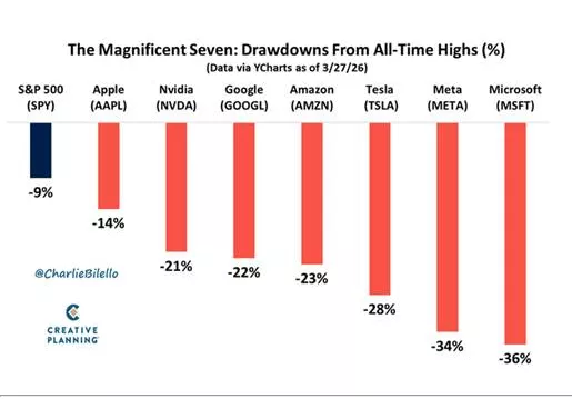 🔻 Έξι από τις επτά μετοχές της λεγόμενης “Magnificent Seven” —οι τίτλοι που οδήγησαν την αγορά τα τελευταία χρόνια— βρίσκονται ήδη σε καθοδική φάση (bear market territory), με απώλειες που φτάνουν έως και το -36%.