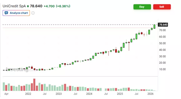 📈 Η δεύτερη μεγαλύτερη τράπεζα της Ιταλίας, η UniCredit, ανεβάζει τον πήχη για το 2026, στοχεύοντας σε καθαρά κέρδη 11 δισ. ευρώ, ξεπερνώντας τις προσδοκίες της αγοράς. Η ώθηση προήλθε σε μεγάλο βαθμό από τις συμμετοχές της στην Alpha Bank και την Commerzbank, που ενίσχυσαν την κερδοφορία του ομίλου το 2025.