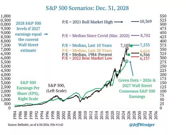 📊 Ο αναλυτής χαρτογράφησε έξι πιθανά σενάρια για τον S&P 500 στο τέλος του 2028, χρησιμοποιώντας ως βάση τις προβλέψεις κερδών του 2027. Το συμπέρασμα είναι ότι οι αγορές δεν κινούνται μόνο από τα κέρδη, αλλά και από την ψυχολογία των επενδυτών.