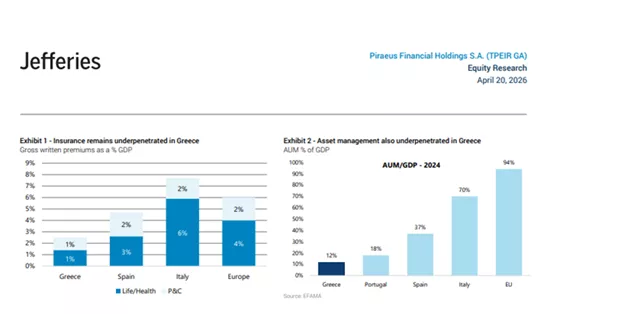 💼 Παράλληλα, η αγορά asset management παραμένει εξαιρετικά μικρή, με τα υπό διαχείριση κεφάλαια να αντιστοιχούν μόλις στο 12% του ΑΕΠ, έναντι πολύ υψηλότερων επιπέδων στην Ε.Ε.