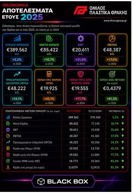 🏭 Ο όμιλος Πλαστικά Θράκης παρουσίασε αξιόλογη βελτίωση αποτελεσμάτων το 2025, αποδεικνύοντας ανθεκτικότητα σε ένα περιβάλλον γεωπολιτικών πιέσεων και χαμηλής διεθνούς ζήτησης. Ο κύκλος εργασιών ανήλθε στα €389,6 εκατ., αυξημένος κατά 5,2%, με βασικό μοχλό την άνοδο όγκων πωλήσεων κατά 7,2%.