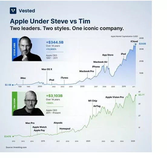 📱 Σε αντίθεση με τον Steve Jobs, που ταυτίστηκε με την επαναστατική καινοτομία, ο Cook ξεχώρισε σε εκτέλεση, εφοδιαστική αλυσίδα, margins, επαναγορές μετοχών και γεωγραφική επέκταση. Υπό την ηγεσία του, η Apple έγινε μηχανή παραγωγής μετρητών.
