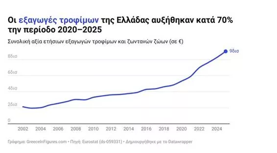 🍅 Οι ελληνικές εξαγωγές τροφίμων και ζωντανών ζώων έφτασαν περίπου τα €9 δισ., σημειώνοντας αύξηση σχεδόν 70% από το 2020 και ουσιαστικό τριπλασιασμό μέσα σε μία δεκαετία. Κυρίαρχος κλάδος παραμένουν τα φρούτα και λαχανικά με περίπου €3,9 δισ., επιβεβαιώνοντας το ισχυρό συγκριτικό πλεονέκτημα της χώρας στον αγροδιατροφικό τομέα.