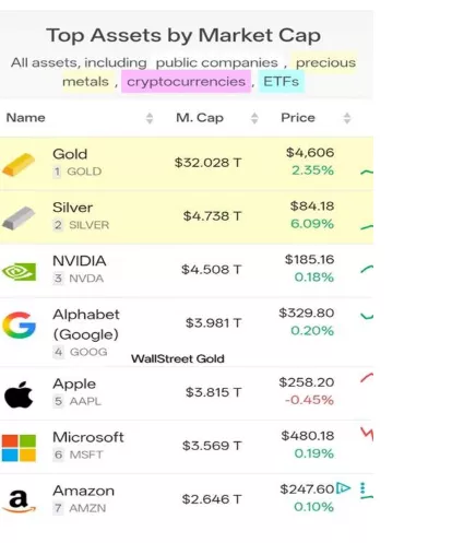 🧠 Η εικόνα είναι αποκαλυπτική: ο χρυσός και το ασήμι βρίσκονται πλέον στην κορυφή των παγκόσμιων assets βάσει κεφαλαιοποίησης, ξεπερνώντας τα μεγαλύτερα τεχνολογικά ονόματα του πλανήτη. Με κεφαλαιοποίηση άνω των $32 τρισ. για τον χρυσό και σχεδόν $4,7 τρισ. για το ασήμι, το μήνυμα των αγορών δεν είναι ουδέτερο.