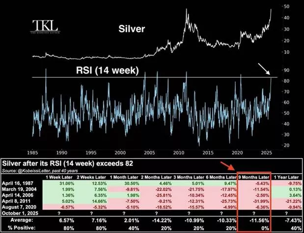 📊 Ο RSI (14 εβδομάδων) στο ασήμι ξεπέρασε το 82 για πρώτη φορά από το 2020. Αυτό έχει συμβεί μόλις 5 φορές τα τελευταία 40 χρόνια.