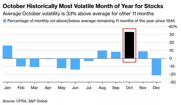 🌀 Ιστορικά, ο Οκτώβριος ξεχωρίζει ως ο μήνας με τη μεγαλύτερη μεταβλητότητα στο χρηματιστήριο. Από το 1945, η μεταβλητότητα του S&P 500 καταγράφεται 33% υψηλότερη σε σχέση με τον μέσο όρο των υπόλοιπων 11 μηνών. Ο Ιανουάριος ακολουθεί δεύτερος, αλλά αρκετά πιο πίσω (+16%).