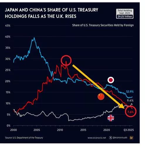 🟦 Το γράφημα αποτυπώνει μια ιστορική μετατόπιση: η Ιαπωνία και η Κίνα –οι δύο μεγαλύτεροι ξένοι κάτοχοι αμερικανικών Treasuries για δεκαετίες– μειώνουν σταθερά τα χαρτοφυλάκιά τους, ενώ το Ηνωμένο Βασίλειο ανεβαίνει. Η πτωτική τάση της Κίνας (από ~30% το 2010 στο 9,4% το 2025) είναι εντυπωσιακή και συνδέεται με γεωπολιτικούς λόγους, ανάγκη άμυνας του γουάν και αποσύνδεση από την αμερικανική οικονομική σφαίρα. Η Ιαπωνία (12,9%) υποχωρεί λόγω της μάχης της Τράπεζας της Ιαπωνίας με τις αποδόσεις και την ενίσχυση του γεν.