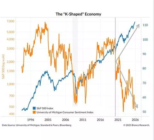 📈 Η «άνω γραμμή» του Κ τροφοδοτείται από AI, επενδυτικές ροές, buybacks και προσδοκίες για σταθεροποίηση επιτοκίων. Αντίθετα, η «κάτω γραμμή» βλέπει υψηλό κόστος ζωής, ακριβή στέγαση, αυξημένα χρέη και συρρίκνωση αποταμιεύσεων.