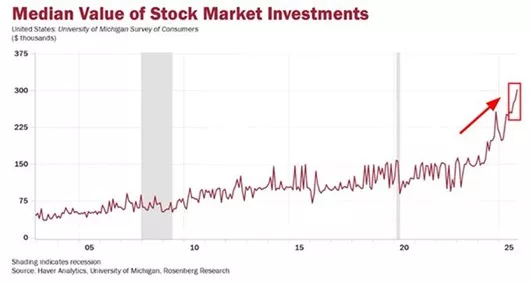 📈 Το πρώτο γράφημα δείχνει πως η μέση αξία των επενδύσεων των Αμερικανών στο χρηματιστήριο ξεπέρασε τα 300.000 δολάρια, τριπλάσια από το 2020. Οι μετοχές καταλαμβάνουν πλέον το 52% του συνολικού πλούτου των νοικοκυριών, ξεπερνώντας ακόμα και τη φού σκα του 2000.