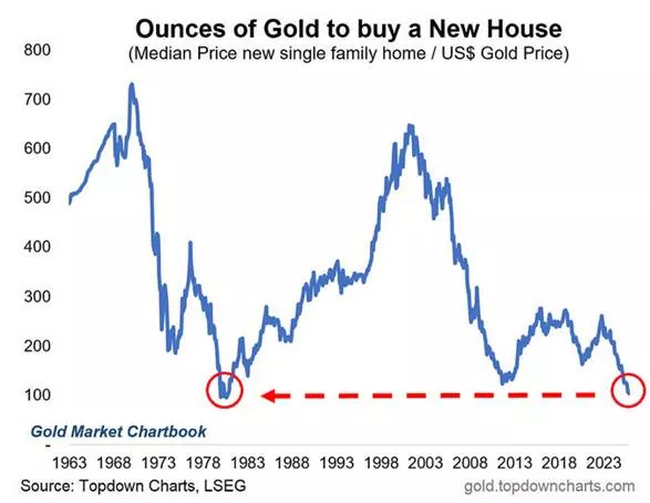 Για να αγοράσει κανείς σήμερα το μέσο νέο σπίτι στις ΗΠΑ χρειάζεται μόλις 102 ουγγιές χρυσού — το χαμηλότερο επίπεδο των τελευταίων 46 ετών!