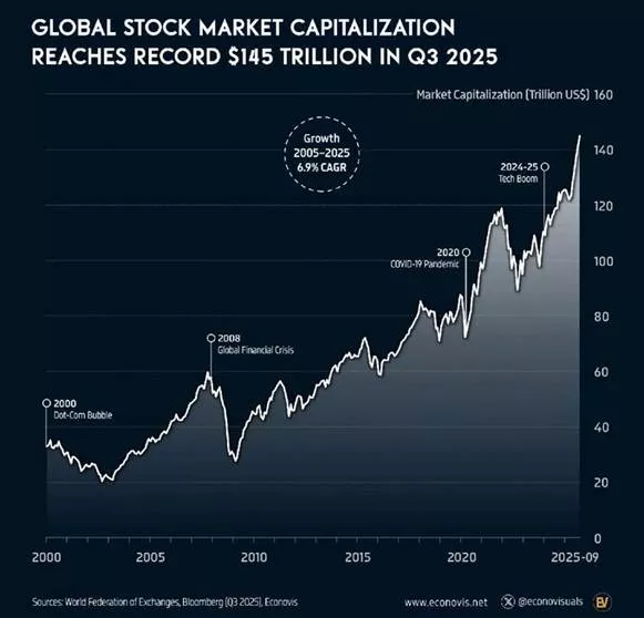 📈 Η παγκόσμια χρηματιστηριακή κεφαλαιοποίηση έφτασε στο ιστορικό ρεκόρ των $145 τρισ. το γ’ τρίμηνο του 2025. Από τα $30 τρισ. του 2008, το παγκόσμιο “χαρτοφυλάκιο” έχει πενταπλασιαστεί.