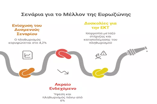 🔹 Σε ένα ακόμη πιο ακραίο ενδεχόμενο, η ευρωζώνη θα μπορούσε να βρεθεί αντιμέτωπη με σύντομη ύφεση και με άνοδο του πληθωρισμού πάνω από το 6%, γεγονός που θα έθετε την ΕΚΤ μπροστά σε ιδιαίτερα δύσκολες αποφάσεις.