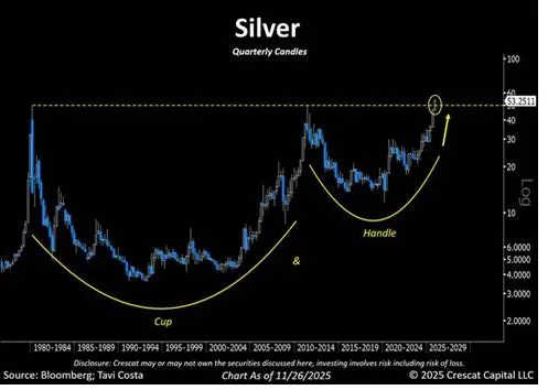 🟡 Το γράφημα του ασημιού σε quarterly candles δείχνει ένα από τα πιο καθαρούς τεχνικούς σηματισμούς της τελευταίας 40ετίας: έναν γιγαντιαίο σχηματισμό Cup & Handle που ξεκινά από τα μέσα των ’80s και ολοκληρώνεται το 2025.