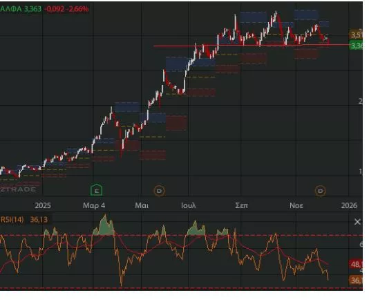 🚨Η ΑΛΦΑ ηγήθηκε την πτώσης των βαριών «χαρτιών» χθες. Χρήζει προσοχής γιατί ενδεχόμενη διάσπαση της στήριξης περί τα 3,30 Ευρώ θα ανατροφοδοτήσει τις πιέσεις. Η μετοχή κινείται πέριξ των 3,5 Ευρώ από τα μέσα του Καλοκαιριού και μετά...
