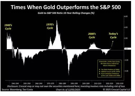 Οι προηγούμενες μεγάλες φάσεις υπεραπόδοσης του χρυσού έναντι του S&P 500 (’40s, ’70s, 2000s) είχαν σημαντική διάρκεια και συνέπεσαν με μεγάλα μακροοικονομικά σοκ: