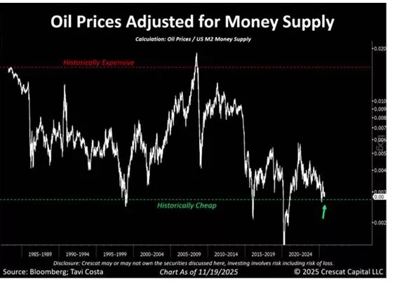 ✨ Το διάγραμμα που ακολουθεί δείχνει κάτι που δεν συμβαίνει συχνά: το πετρέλαιο, όταν προσαρμόζεται για την αμερικανική προσφορά χρήματος (M2), βρίσκεται στα ιστορικά φθηνότερα επίπεδα των τελευταίων 40 ετών.