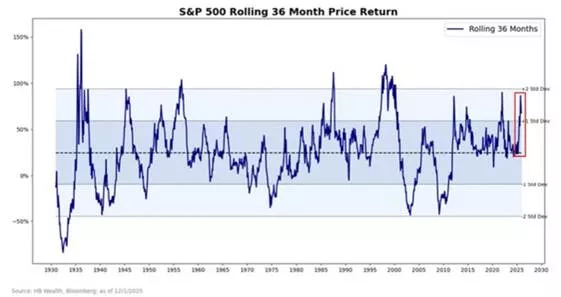 📈 Η αγορά γράφει ιστορικά νούμερα. Ο S&P 500 έχει ενισχυθεί +68% την τελευταία τριετία, καταγράφοντας τη δεύτερη ισχυρότερη περίοδο από τη φούσκα του 2000 και καλύτερη ακόμη και από την ανάκαμψη μετά το 2008. Είναι επίσης η 16η φορά από το 1930 που η τριετής απόδοση ξεπερνά τις +1,5 τυπικές αποκλίσεις, ένα επίπεδο που συναντάται μόνο σε φάσεις έντονης υπεραπόδοσης και υπερβολικής ορμής.