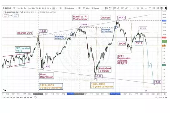 Η πρόβλεψη στο γράφημα δείχνει κατάρρευση προς το 0,69 ως το 2037 — δηλαδή ο Dow να αξίζει λιγότερο από 1 ουγγιά χρυσού.