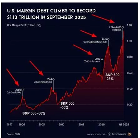 💣 Η αγορά μετοχών με δανεικά (margin debt) στις ΗΠΑ εκτοξεύτηκε στα 1,13 τρισ. δολάρια, νέο ιστορικό ρεκόρ. Μόνο τον Σεπτέμβριο αυξήθηκε κατά 67 δισ., δηλαδή +6,3% σε ένα μήνα και +39% σε πέντε μήνες – ρυθμοί που είδαμε τελευταία φορά στο φούσκωμα του 2021, λίγο πριν το sell-off του 2022.