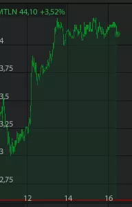 Η μετοχή της MTLN την Παρασκευή έκλεισε στα 44 Ευρώ +3,29% και 384 χιλ. τεμάχια αξίας 16,8 εκατ. Ο μέσος όρος του τελευταίου μήνα ήταν 332 χιλ. τεμάχια ημερησίως.