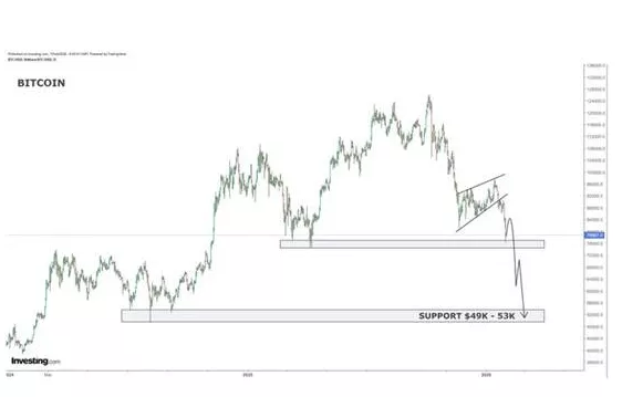 📉 Το διάγραμμα του Bitcoin αποτυπώνει με καθαρό τρόπο τη μετάβαση από την ευφορία στην αμφιβολία. Η μακροπρόθεσμη ανοδική γραμμή τάσης, που στήριξε την κίνηση από τα χαμηλά του 2024, έχει πλέον παραβιαστεί. Η πρόσφατη κίνηση δεν θυμίζει υγιή διόρθωση αλλά δομική κόπωση.