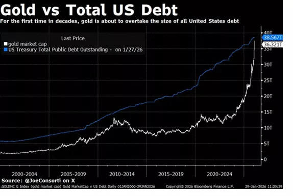 📈 Το διάγραμμα αποτυπώνει μια ιστορική σύγκλιση: για πρώτη φορά μετά από δεκαετίες, η συνολική κεφαλαιοποίηση του χρυσού πλησιάζει –και απειλεί να ξεπεράσει– το συνολικό δημόσιο χρέος των ΗΠΑ. Από τις αρχές της δεκαετίας του 2000, το αμερικανικό χρέος ακολουθεί μια σχεδόν γραμμική, αδιάλειπτη άνοδο. Ο χρυσός, αντίθετα, κινείται κυκλικά, αλλά τα τελευταία χρόνια εμφανίζει επιτάχυνση που θυμίζει αλλαγή καθεστώτος.