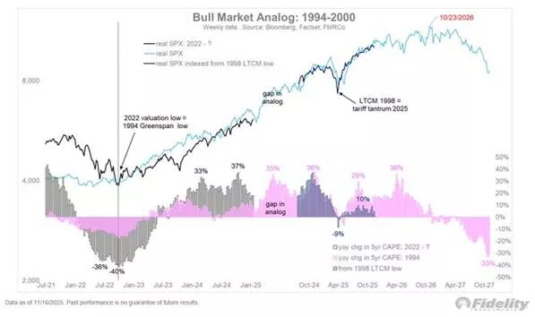 🌐 Το διάγραμμα της Fidelity συγκρίνει την πορεία του S&P 500 από το 2022 έως σήμερα με τον ιστορικό ανοδικό κύκλο της περιόδου 1994–2000. Οι δύο πορείες εμφανίζουν εντυπωσιακή ομοιότητα, υποδηλώνοντας ότι η παρούσα αγορά επαναλαμβάνει το ίδιο μοτίβο ψυχολογίας και αποτίμησης.
