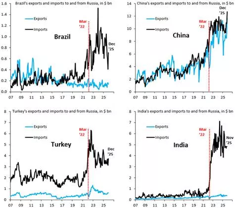 🌍 Μετά τον Μάρτιο του 2022, όταν επιβλήθηκαν οι δυτικές κυρώσεις, καταγράφεται μια ιστορική ανακατεύθυνση εμπορικών ροών της Ρωσίας προς τις αναδυόμενες οικονομίες. Τα διαγράμματα δείχνουν ξεκάθαρα ότι χώρες όπως Κίνα, Ινδία και Τουρκία εκτόξευσαν τις εισαγωγές τους από τη Ρωσία — κυρίως σε ενέργεια και πρώτες ύλες.