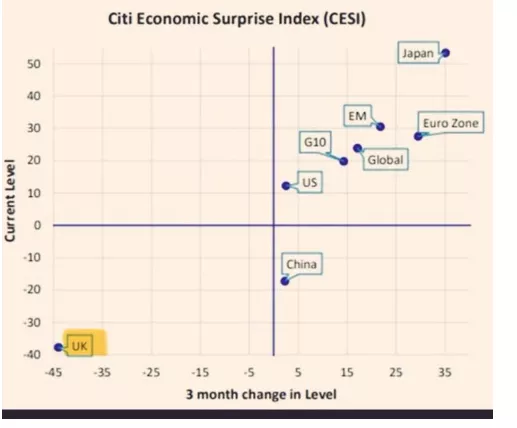 📉 Τα στοιχεία δεν αφήνουν πολλά περιθώρια παρερμηνείας. Η βρετανική οικονομία βρίσκεται στο κάτω αριστερό τεταρτημόριο του Citi Economic Surprise Index: αρνητικές εκπλήξεις και επιδείνωση της τάσης. Όχι απλώς slowdown — καθαρή αποσύνθεση.