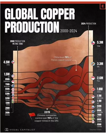 🚨 Ο παγκόσμιος χάρτης παραγωγής χαλκού δείχνει μια φαινομενικά κλασική εικόνα: η Χιλή, το Κονγκό και το Περού παραμένουν οι μεγαλύτεροι παραγωγοί, ενώ η ίδια η Κίνα δεν βρίσκεται στην κορυφή. Όμως αυτή είναι μόνο η επιφάνεια.