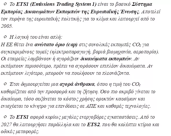 🔹 Αν η επανεξέταση του ETS1 οδηγήσει σε χαμηλότερες τιμές CO₂ ή σε πιο «χαλαρό» μηχανισμό, μειώνεται το τεχνητό κόστος που επιβαρύνει το φυσικό αέριο και τον άνθρακα. Αυτό περιορίζει το ανταγωνιστικό πλεονέκτημα των ΑΠΕ, το οποίο τα τελευταία χρόνια στηρίχθηκε σε μεγάλο βαθμό στο αυξημένο κόστος εκπομπών.