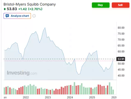 🧩 Η Bristol Myers εμφανίζεται ως κλασικό turnaround value play. Η μετοχή κινείται κοντά στα $51, με αρνητική επίδοση το 2025 λόγω απογοητεύσεων στο pipeline και της βαριάς σκιάς από τις λήξεις πατεντών, κυρίως του Revlimid. Η αγορά προεξοφλεί πτώση κερδών και «τιμωρεί» τη μετοχή, οδηγώντας την αποτίμηση σε P/E ~8x για το 2026, από τα χαμηλότερα στον φαρμακευτικό κλάδο.