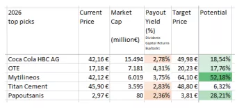 Η στρατηγική επικεντρώνεται σε εταιρείες με ορατότητα κερδών, μερίσματα και μόχλευση στις ευρωπαϊκές προτεραιότητες. Ξεχωρίζουν Metlen (διπλασιασμός EBITDA έως το 2028), Coca-Cola HBC (Αφρική), OTE, Titan Cement και Papoutsanis. Παράλληλα, διατηρούνται θέσεις σε Jumbo, Motor Oil, Aegean, Performance Technologies, Profile, Qualco και OPAP.