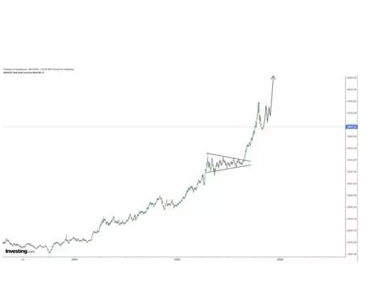 Η διάσπαση ανοδικά σηματοδοτεί συνέχιση της κύριας τάσης με στόχο $4.400–4.600/oz, ίσως μετά από μικρή “αναπνοή”.