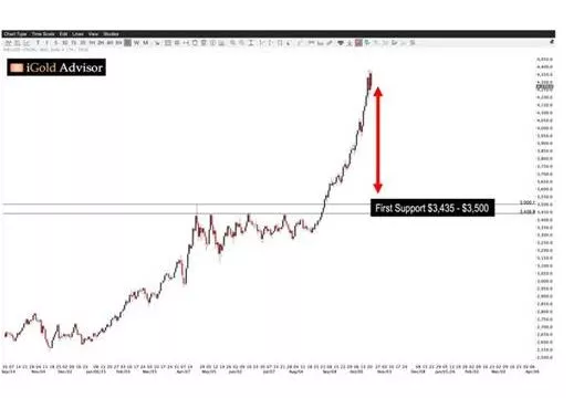 Μετά το ράλι, ο χρυσός έχει εισέλθει σε υπεραγορασμένη περιοχή. Οι τιμές μπορεί να υποχωρήσουν προς τη στήριξη $3.435–3.500, περιοχή της προηγούμενης διάσπασης.