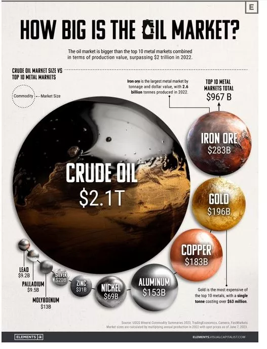 🌍 Παρά την παγκόσμια στροφή προς την «πράσινη ενέργεια», το πετρέλαιο παραμένει ο αδιαμφισβήτητος βασιλιάς της οικονομίας. Με αξία $2,1 τρισεκατομμύρια, η αγορά του ξεπερνά όλες τις κορυφαίες αγορές μετάλλων μαζί. Ο «μαύρος χρυσός» εξακολουθεί να κινεί φορτηγά, στρατούς, πλοία και κυρίως —τις ισορροπίες εξουσίας.