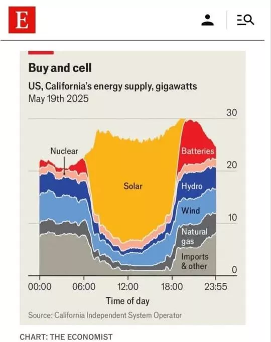 💡 Το διάγραμμα του Economist για τις 19 Μαΐου 2025 αποτυπώνει το νέο ενεργειακό τοπίο της Καλιφόρνιας. Η ηλιακή ενέργεια δεσπόζει στο μεσημέρι, φτάνοντας τα 20 GW, ενώ τη νύχτα κυριαρχούν φυσικό αέριο, άνεμος και υδροηλεκτρικά. Οι μπαταρίες λειτουργούν ως ρυθμιστές, αποθηκεύοντας φθηνή ηλιακή ενέργεια τη μέρα και αποδίδοντάς την το βράδυ.