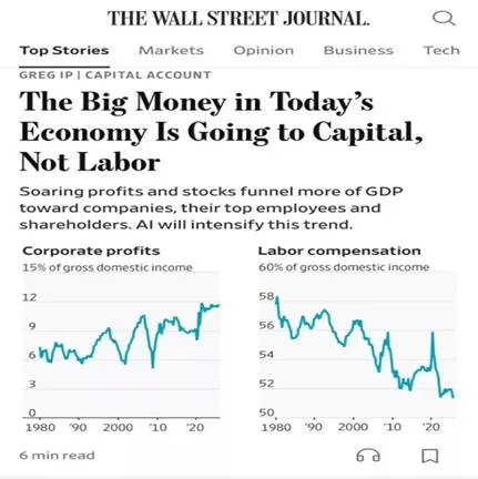 🧩 Η Wall Street Journal κάνει κάτι σπάνιο: περιγράφει καθαρά αυτό που εδώ και χρόνια συμβαίνει κάτω από τον θόρυβο των αγορών. Το μερίδιο της εργασίας στο εισόδημα υποχωρεί, ενώ το κεφάλαιο –εταιρικά κέρδη, μετοχές, περιουσιακά στοιχεία– απορροφά όλο και μεγαλύτερο κομμάτι της οικονομικής πίτας.