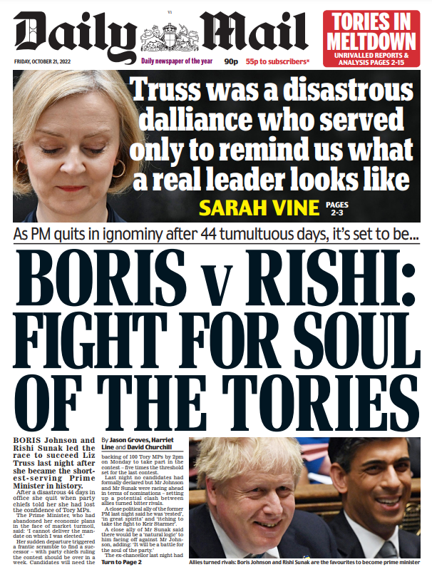 Η ταμπλόιντ Mirror αναφέρει ότι ο βρετανικός λαός απαιτεί «Γενικές Εκλογές Τώρα» ενώ η Daily Mail βλέπει κόντρα Μπόρις Τζόνσον – Ρίσι Σουνάκ για «την Ψυχή των Τόρις».