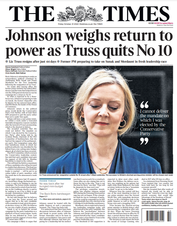 Και οι Τάιμς του Λονδίνου αναφέρονται στο γεγονός ότι ο Τζόνσον «ζυγίζει» την επιστροφή του στην εξουσία.