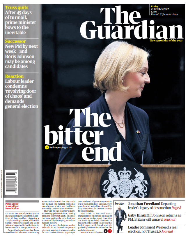 Ο βρετανικός Τύπος της επόμενης μέρας της παραίτησης -εξπρές της Λιζ Τρας από την πρωθυπουργία, στα πρωτοσέλιδα του, δίνει το στίγμα των εξελίξεων.