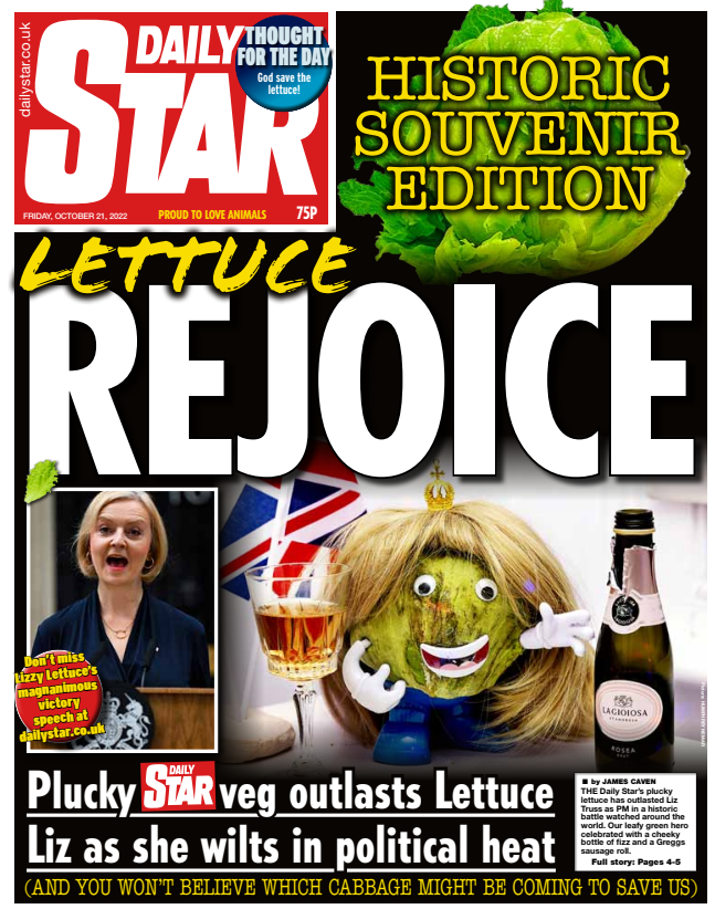 H Daily Star δε επιμένοντας στην κόντρα που είχε ξεκινήσει μεταξύ της διάρκειας ζωής ενός μαρουλιού και της Τρας στην εξουσία, αναφέρει ότι το μαρούλι μπορεί να χαίρεται!