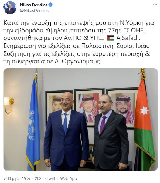 Κατά την έναρξη της επίσκεψής του στη Νέα Υόρκη για την εβδομάδα Υψηλού επιπέδου της 77ης Γενικής Συνέλευσης του ΟΗΕ, ο υπουργός Εξωτερικών Νίκος Δένδιας συναντήθηκε με τον αναπληρωτή πρωθυπουργό και υπουργό Εξωτερικών της Ιορδανίας Αϊμάν Σαφάντι (Ayman Safadi).