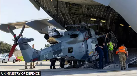 Σε εικόνες που δημοσίευσε το Υπουργείο Άμυνας, φαίνεται ένα ελικόπτερο να εκφορτώνεται από ένα C-17 της Βασιλικής Αεροπορίας στην Κύπρο.