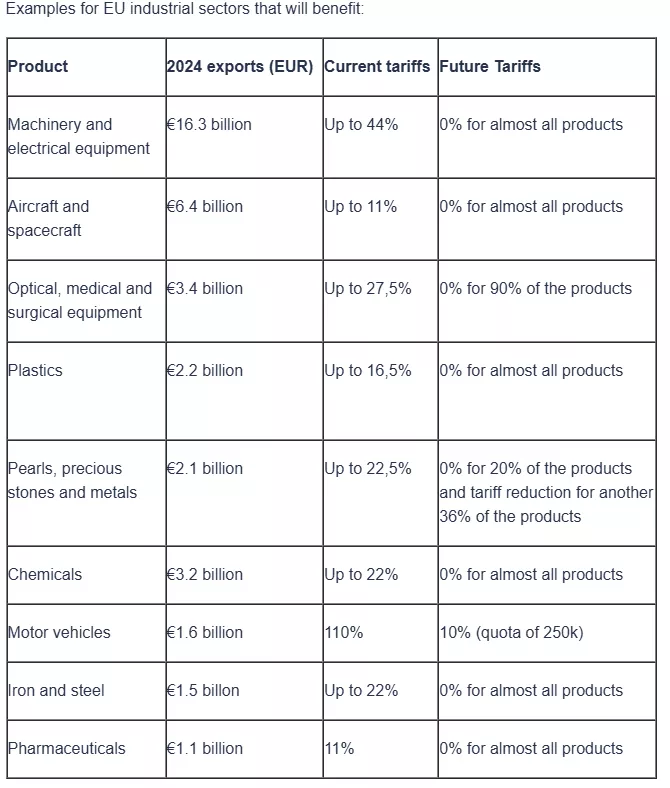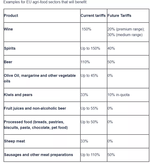 Η συμφωνία καταργεί ή μειώνει τους συχνά απαγορευτικούς δασμούς (πάνω από 36% κατά μέσο όρο) στις εξαγωγές γεωργικών προϊόντων διατροφής της ΕΕ, ανοίγοντας μια τεράστια αγορά για τους Ευρωπαίους αγρότες. Ευαίσθητοι ευρωπαϊκοί γεωργικοί τομείς, όπως το βόειο κρέας, η ζάχαρη ή το ρύζι, δεν θα απελευθερωθούν καθόλου.