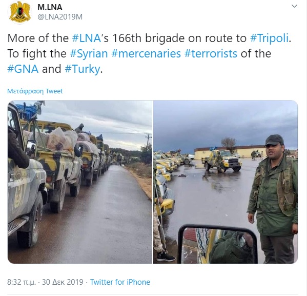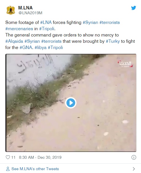 «Η Γενική Διοίκηση του Εθνικού Στρατού της Λιβύης (LNA – του στρατάρχη Χαφτάρ) έδωσε εντολές να μην υπάρξει κανένα έλεος στους Σύρους τρομοκράτες της Αλ Κάιντα που μεταφέρθηκαν από την Τουρκία για να πολεμήσουν για τον GNA ( Κυβέρνηση Εθνικής Ενότητας - oι δυνάμεις του Φαγιέζ αλ Σάρατζ)» είναι το μήνυμα που στέλνουν με ανάρτησή τους στο twitter οι δυνάμεις του Στρατηγού Χαφτάρ, παραθέτοντας πλάνα από συγκρούσεις με Σύρους στην Τρίπολη.