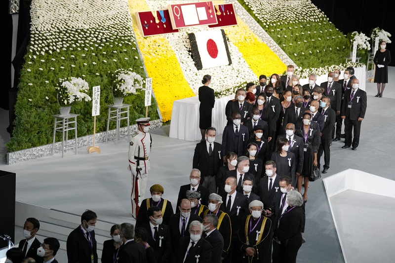 Η τελετή ξεκίνησε στις 2.00 μ.μ. (08:00 ώρα Ελλάδας) με τη χήρα του Άμπε, Ακίε, να φθάνει κρατώντας την τεφροδόχο με την τέφρα του συζύγου της στο Nippon Budokan Hall στο κέντρο του Τόκιο, ενώ παιάνιζε η στρατιωτική μπάντα και αντηχούσε στην αίθουσα ο ήχος των τιμητικών κανονιοβολισμών.